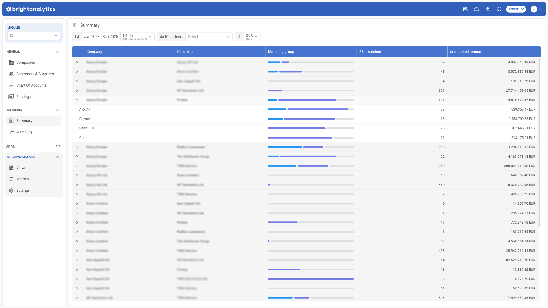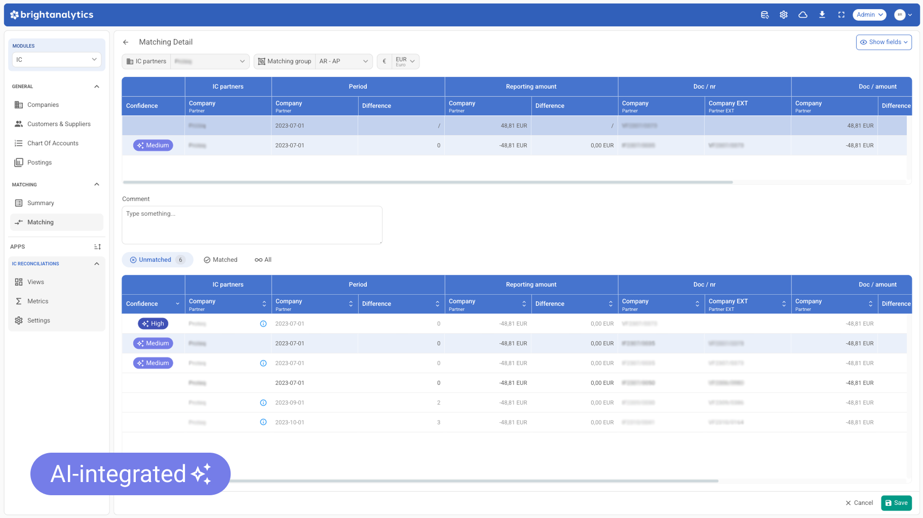 Intercompany reconciliation is the process of matching and verifying financial transactions between entities within the same group. With BrightAnalytics, this becomes a seamless step in your consolidation process thanks to automated matching and clear reporting.